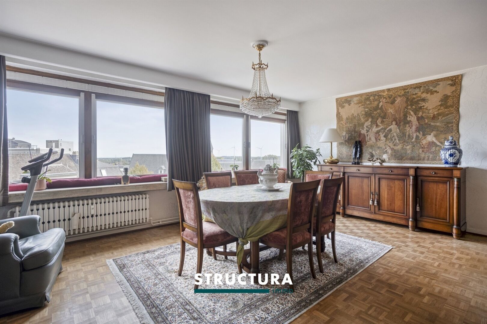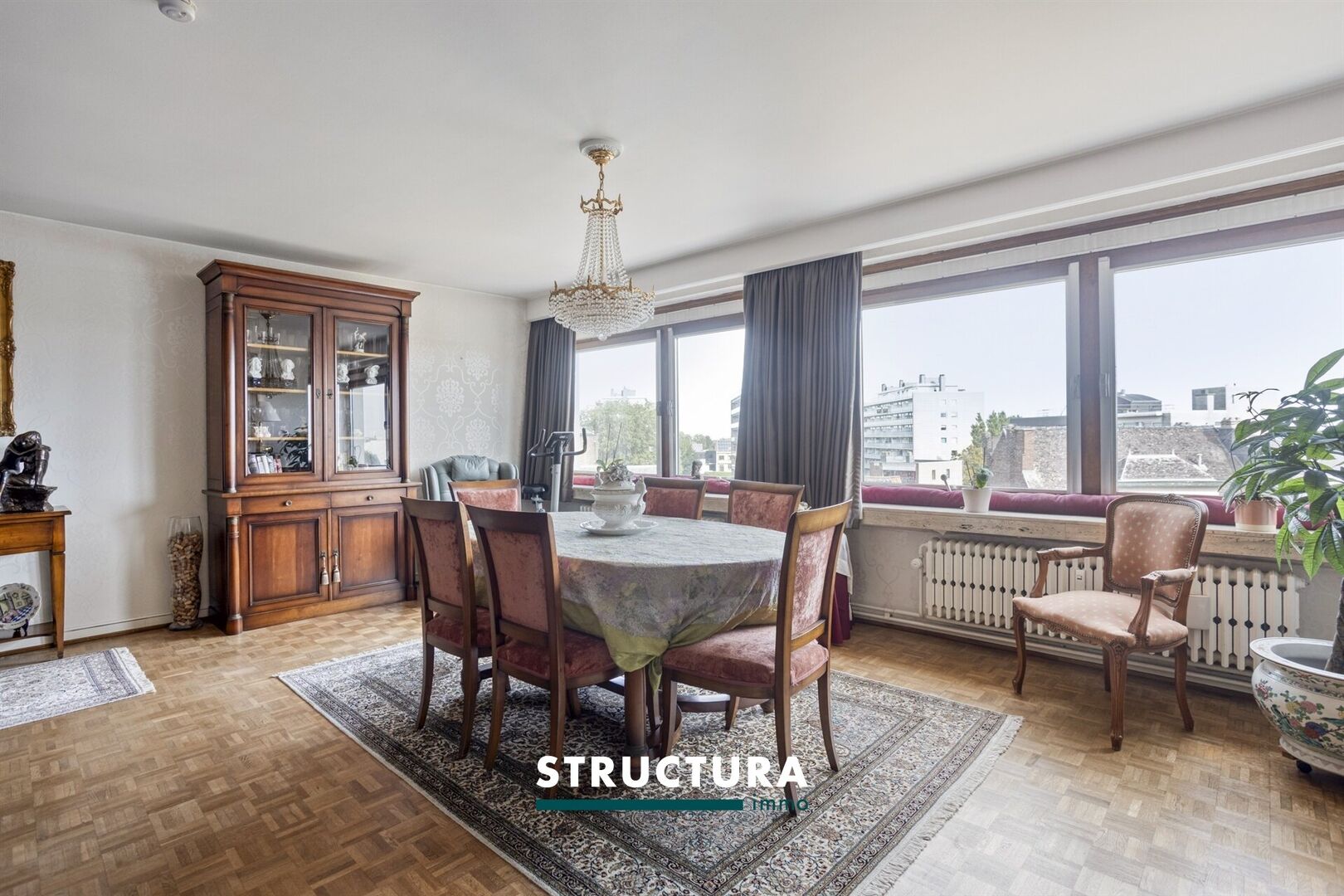 Le vaste séjour, baigné de lumière grâce aux grandes baies vitrées sur toute la largeur, offre une vue imprenable sur le centre-ville.