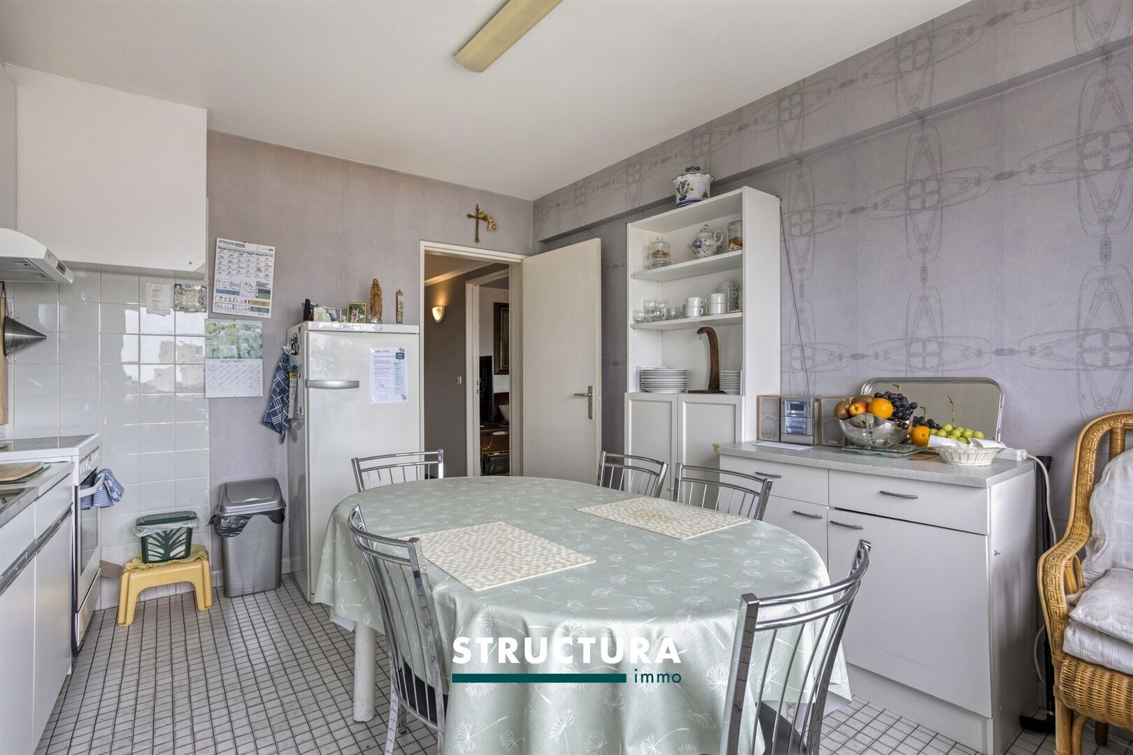 Le living communique harmonieusement avec la cuisine, elle aussi particulièrement spacieuse, dotée d’un espace de rangement attenant.