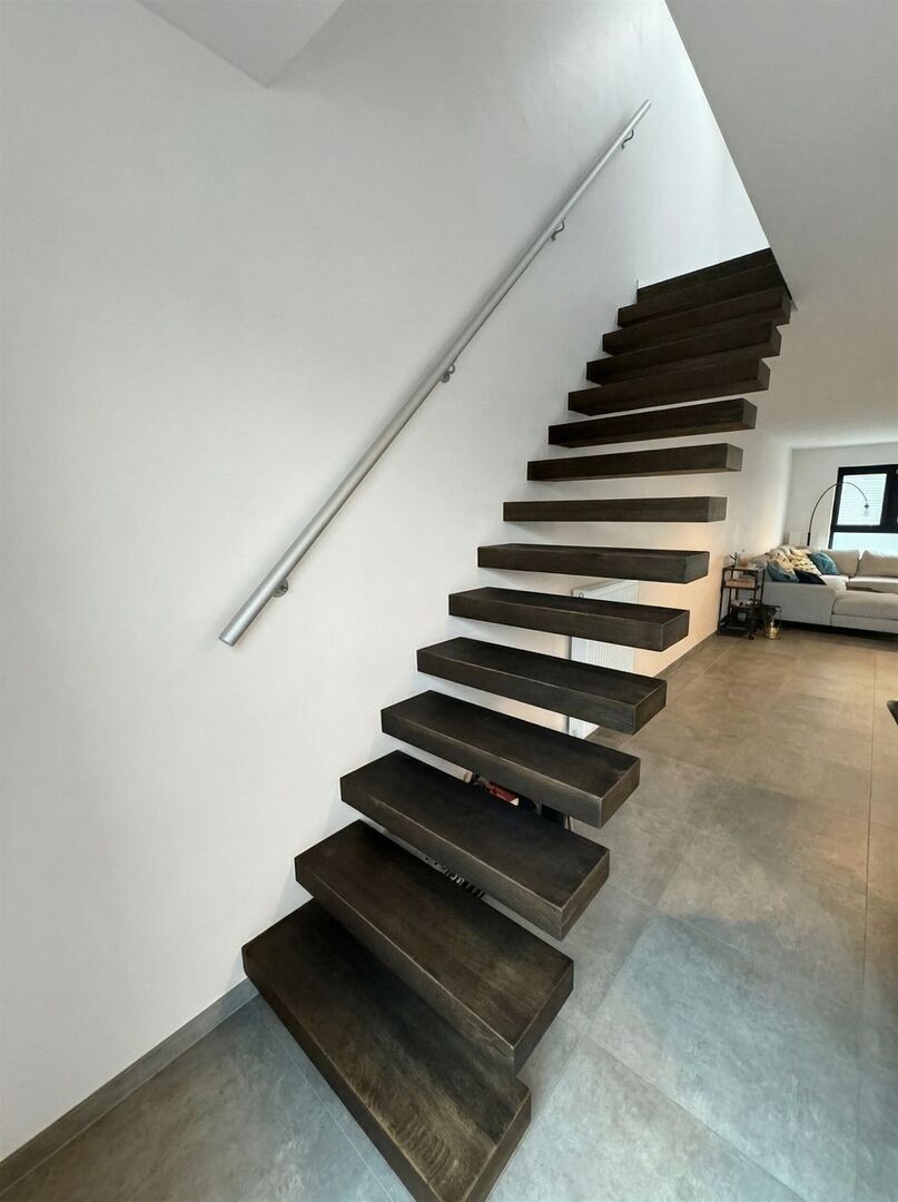 Eerste verdiep: inkomhal, aparte toilet, living met open keuken, bergruimte, terras.