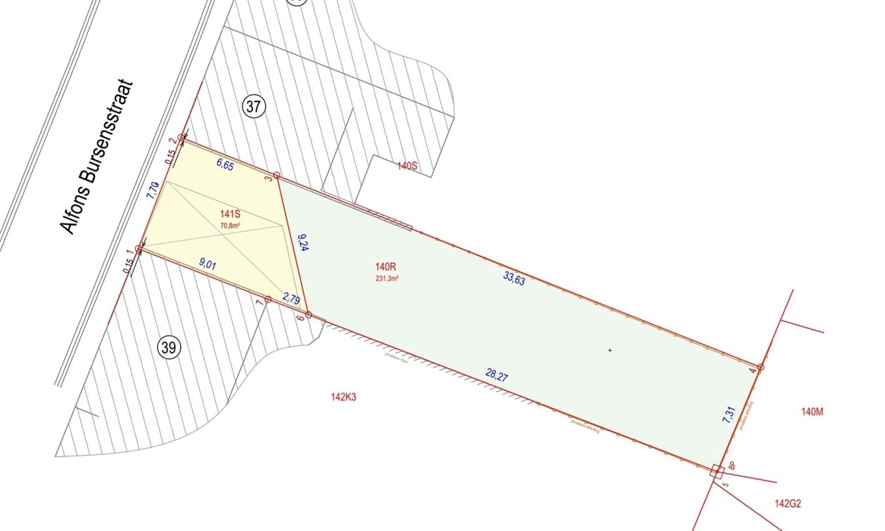 Gemeente MERCHTEM – Tweede afdeling : een perceel bouwgrond bestemd voor een gesloten bebouwing gelegen aan de Alfons Bursensstraat, kadastraal bekend volgens recent kadastraal uittreksel sectie K, nummers 140R en 141S, met een oppervlakte volgens meting van 3a are 02 centiare en met een voorgevelbreedte volgens plan van 7m 70cm.