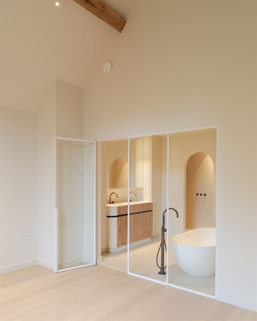 De masterbedroom vormt een ware privésuite (+/- 24,5m²) met ingewerkte maatkasten in massieve eik en een luxueuze ensuite badkamer, uitgerust met vrijstaand ligbad, ruime inloopdouche, toilet en dubbele lavabo.